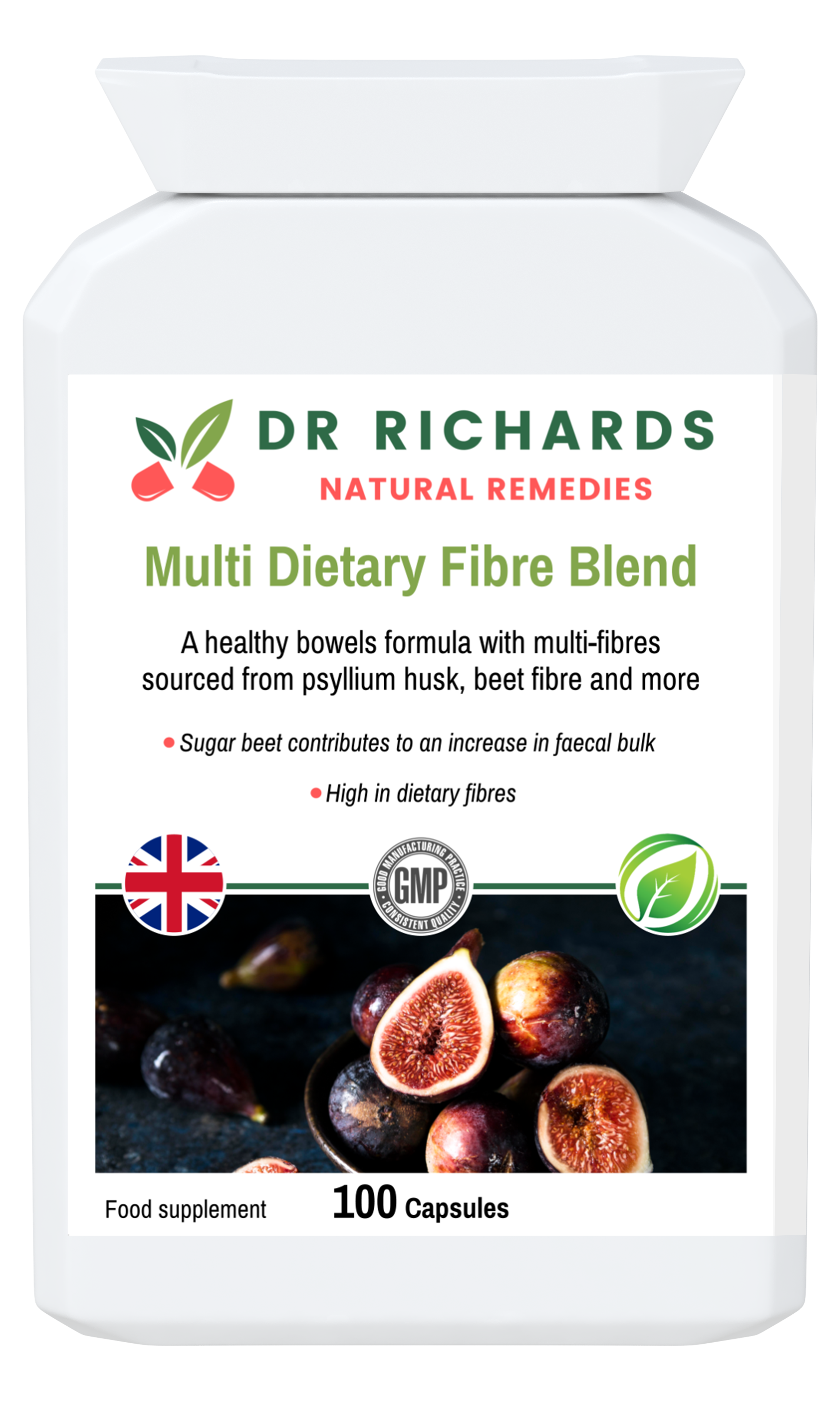 Ingredients: Psyllium Husk Powder (Plantago ovata), Capsule Shell: Hydroxypropyl Methylcellulose (HPMC), Flaxseed Powder (Linum usitatissimum), Sugar Beet Fibre Powder (Beta Vulgaris), Stoneground Brown Rice Flour (Oryza Sativa), Apple Pectin Powder (Malus pumila), Rice Extract (Oryza Sativa), Rhubarb Root Extract (Rheum Palmatum), Fenugreek Seed Extract (Trigonella Foenum-Graecum), Prune Juice Extract (Prunus Salicinas), Broccoli Extract (Brassica Oleracea), Fig Fruit Extract (Ficus Carica), Carrot Powder (Daucus carota), Rice Concentrate (Oryza Sativa), Fennel Seed Extract (Foeniculum Vulgare).